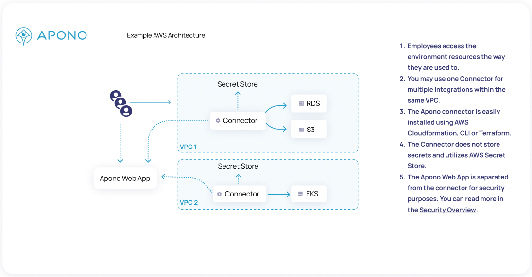 * **Doesn't access your data or environment**, and only communicates with the Apono connector.