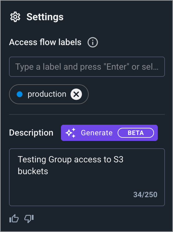 <table><thead><tr><th width="204">Setting</th><th>Description</th></tr></thead><tbody><tr><td><strong>Access flow labels</strong></td><td><p>Identifies an access flow for streamlined organization and use</p><p>When assigned to an access flow, labels appear in the access flow tiles on the <a href="https://app.apono.io/access-flows"><strong>Access Flows</strong></a> page.</p><p>Follow these steps:</p><ol><li>Enter a value.</li><li>Press Enter on your keyboard or select an existing label from the filtered list.</li></ol></td></tr><tr><td><strong>Description</strong></td><td><p>Access flow summary automatically generated after defining the name, grantee, and resources</p><p>To keep the description aligned with changes in the access flow, click <strong>Generate</strong> to refresh it with the latest updates:</p><ol><li>Click <strong>Generate</strong>. Apono will populate the field with a new description.</li><li>(Optional) Review and manually edit the description.</li><li>(Optional) Provide feedback on the description. Click <img src="https://1094436629-files.gitbook.io/~/files/v0/b/gitbook-x-prod.appspot.com/o/spaces%2Fv6MBfUGvblSdAz31yJXm%2Fuploads%2Fgit-blob-d868fa52ded73e3907fd4a933a7604a7ca609c7b%2Faccess-clarity-approve.png?alt=media" alt="" data-size="line"> (thumbs up icon) if the description was helpful. Click <img src="https://1094436629-files.gitbook.io/~/files/v0/b/gitbook-x-prod.appspot.com/o/spaces%2Fv6MBfUGvblSdAz31yJXm%2Fuploads%2Fgit-blob-ca6382f453f0c527252bc69d4df55144f98992a5%2Faccess-clarity-disapprove.png?alt=media" alt="" data-size="line"> (thumbs down icon) and add a comment if the description was unhelpful.</li></ol></td></tr></tbody></table>