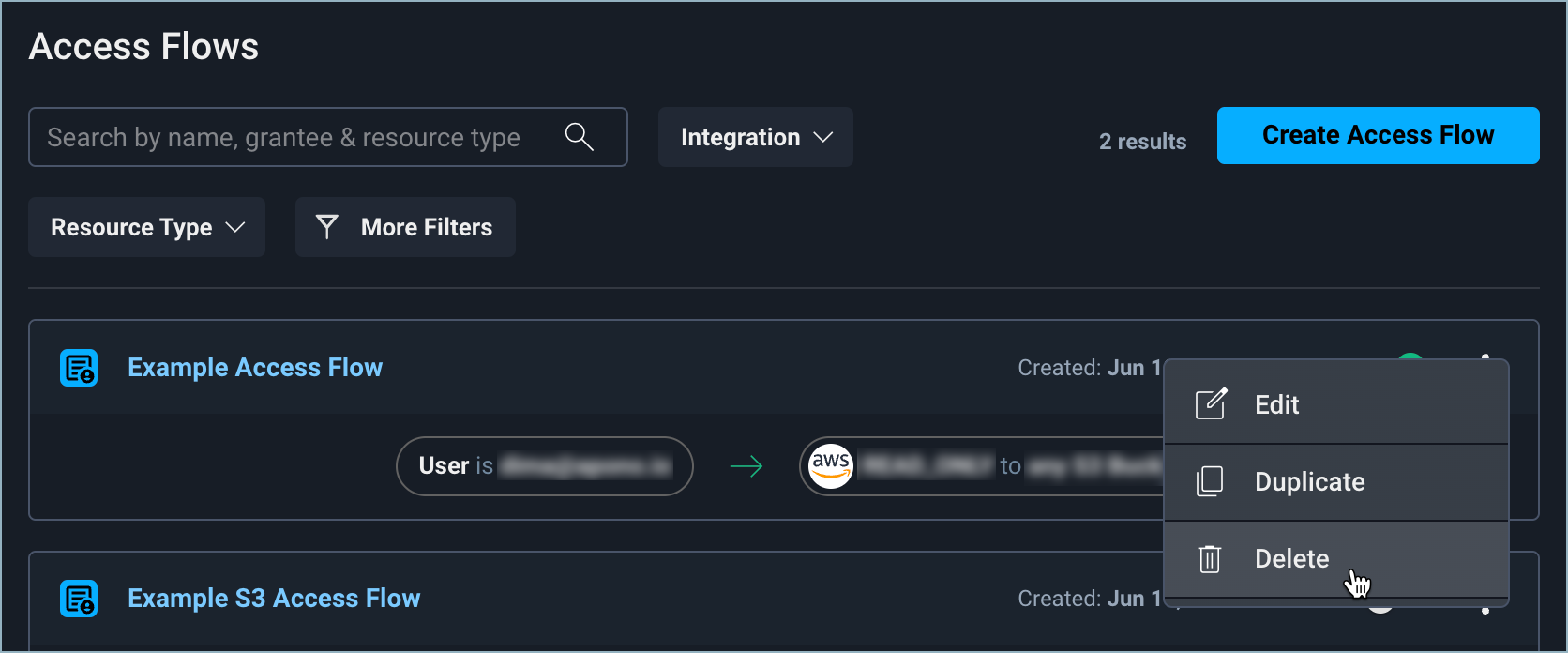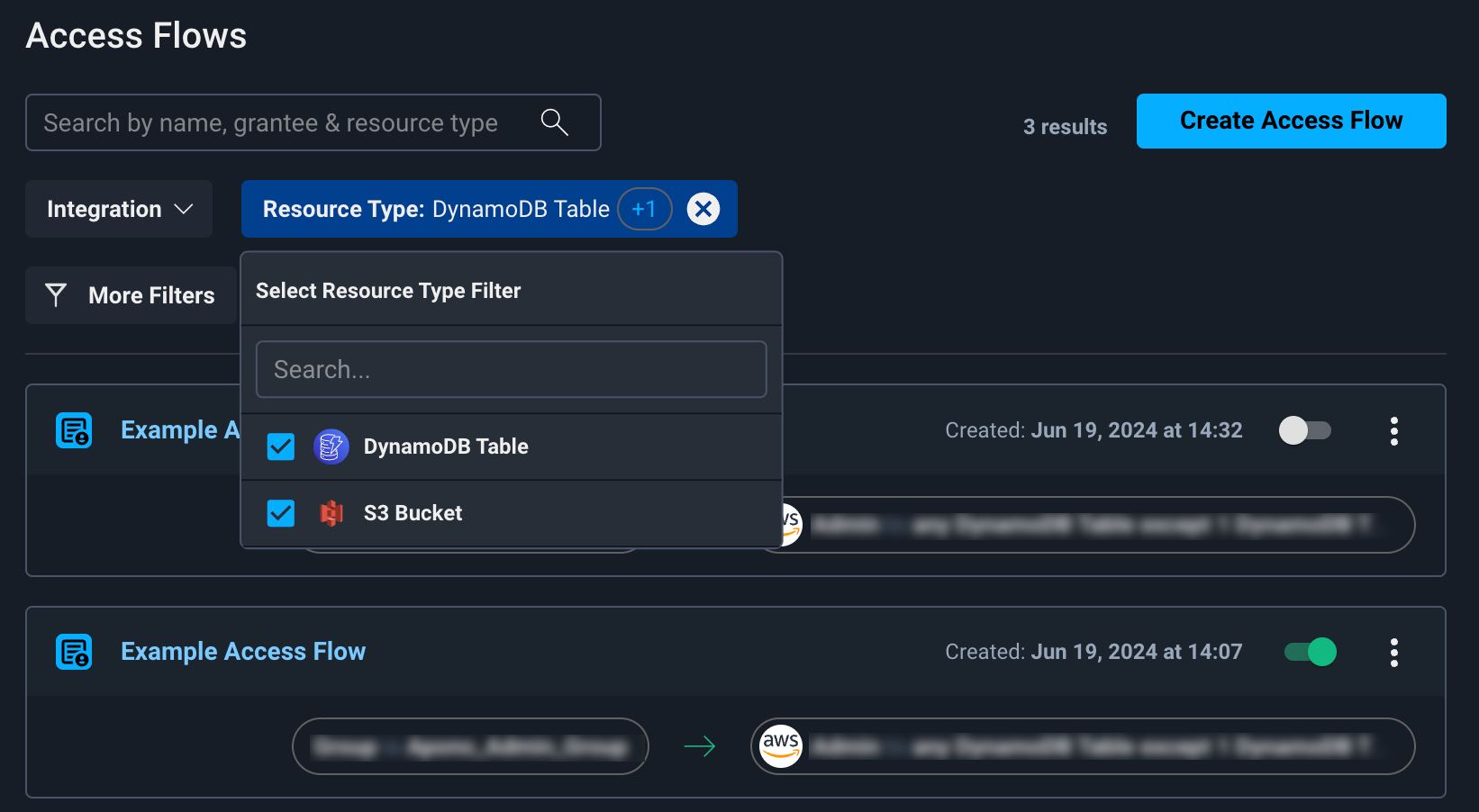 <table><thead><tr><th width="197">Filter</th><th>Description</th></tr></thead><tbody><tr><td><strong>Integration</strong></td><td><p>Reveals access flows according to the integrations they manage<br><br>Follow this step to apply the filter:</p><ol><li>From the <strong>Integration</strong> dropdown menu, select one or more integrations.<br><br><strong>NOTE</strong>: You may enter keywords into the search bar to locate an integration.</li></ol></td></tr><tr><td><strong>Resource Type</strong></td><td><p>Reveals access flows according to the resource types they manage<br><br>Follow this step to apply the filter:</p><ol><li>From the <strong>Resource Type</strong> dropdown menu, select one or more resource types.<br><br><strong>NOTE</strong>: You may enter keywords into the search bar to locate a resource type.</li></ol></td></tr></tbody></table>