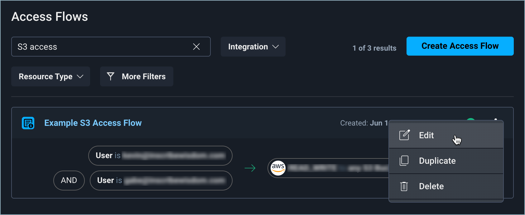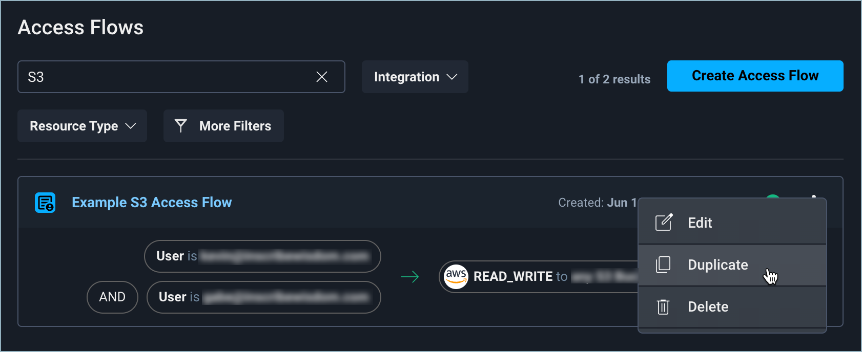 2. In the row of the access flow, click **⋮ > Duplicate**. The duplicate (**Copy**) flow appears in the **Access Flows** table.