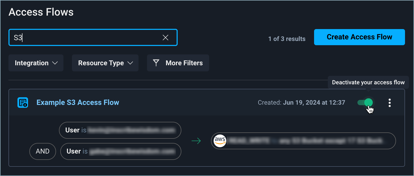 Deactivating an access flow changes its status to inactive and stops it from managing access to its specified resources. However, deactivating an access flow does **not** result in deletion. The template remains in the **Access Flows** page.