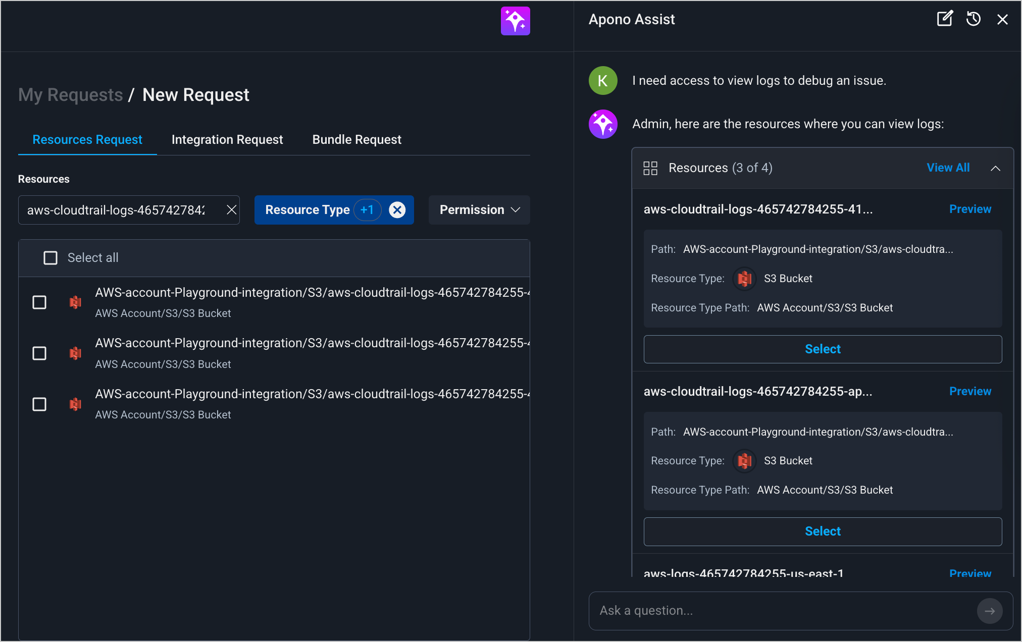 For example, you can type: `I need access to view logs to debug an issue.` Apono Assist identifies relevant log-related resources, suggests the appropriate permissions, and helps create the access request with minimal input.