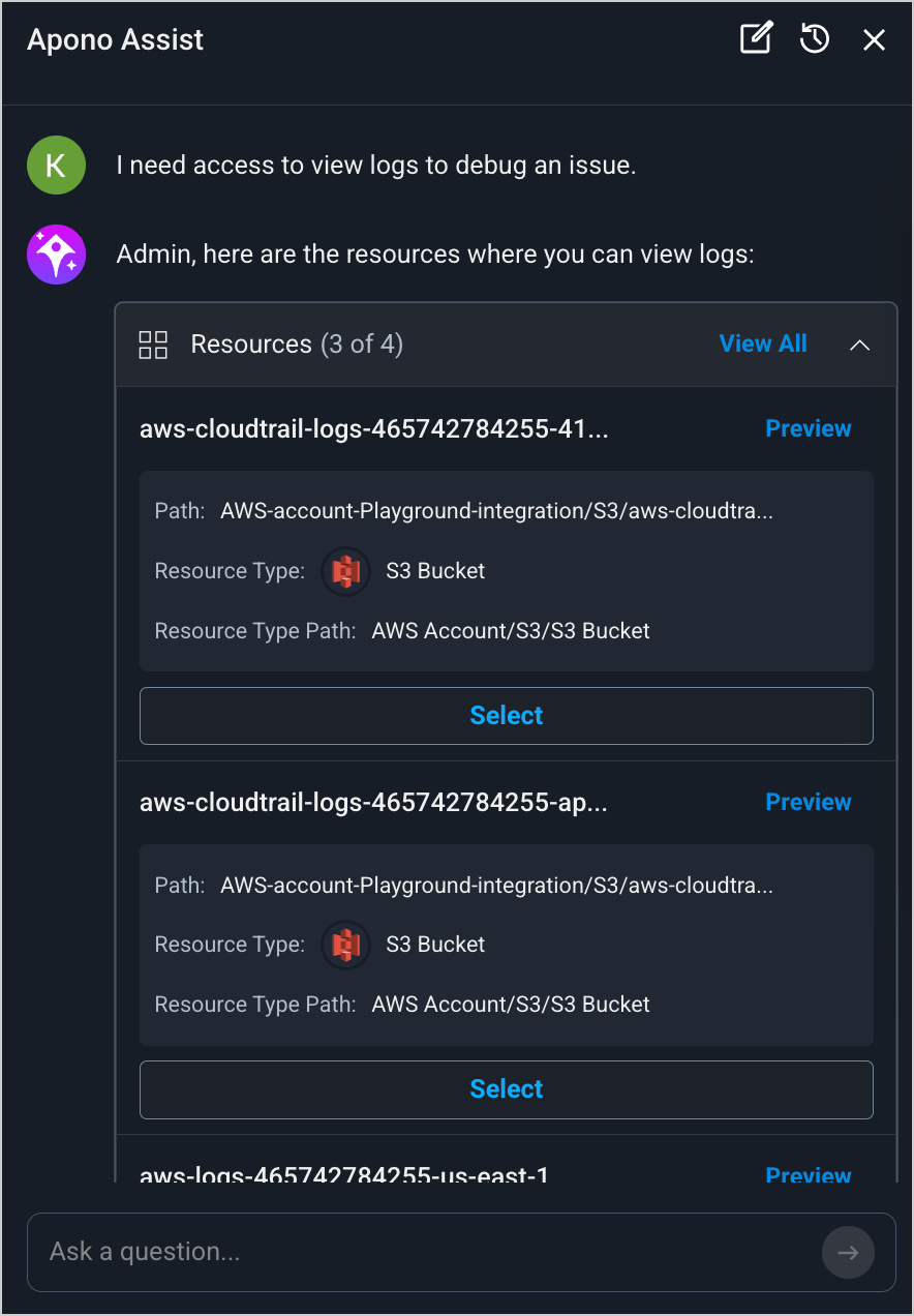 4. **Select** a resource. Apono Assist may ask additional questions depending on the resources.