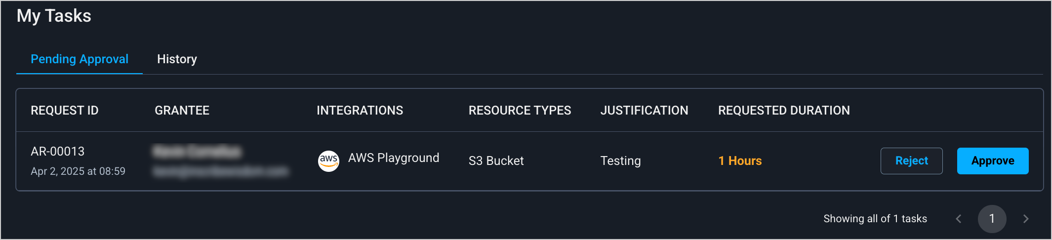 1. On the [**My Tasks**](https://portal.apono.io/tasks) page, click the **Pending Approval** tab. A list of requests requiring your review appears.