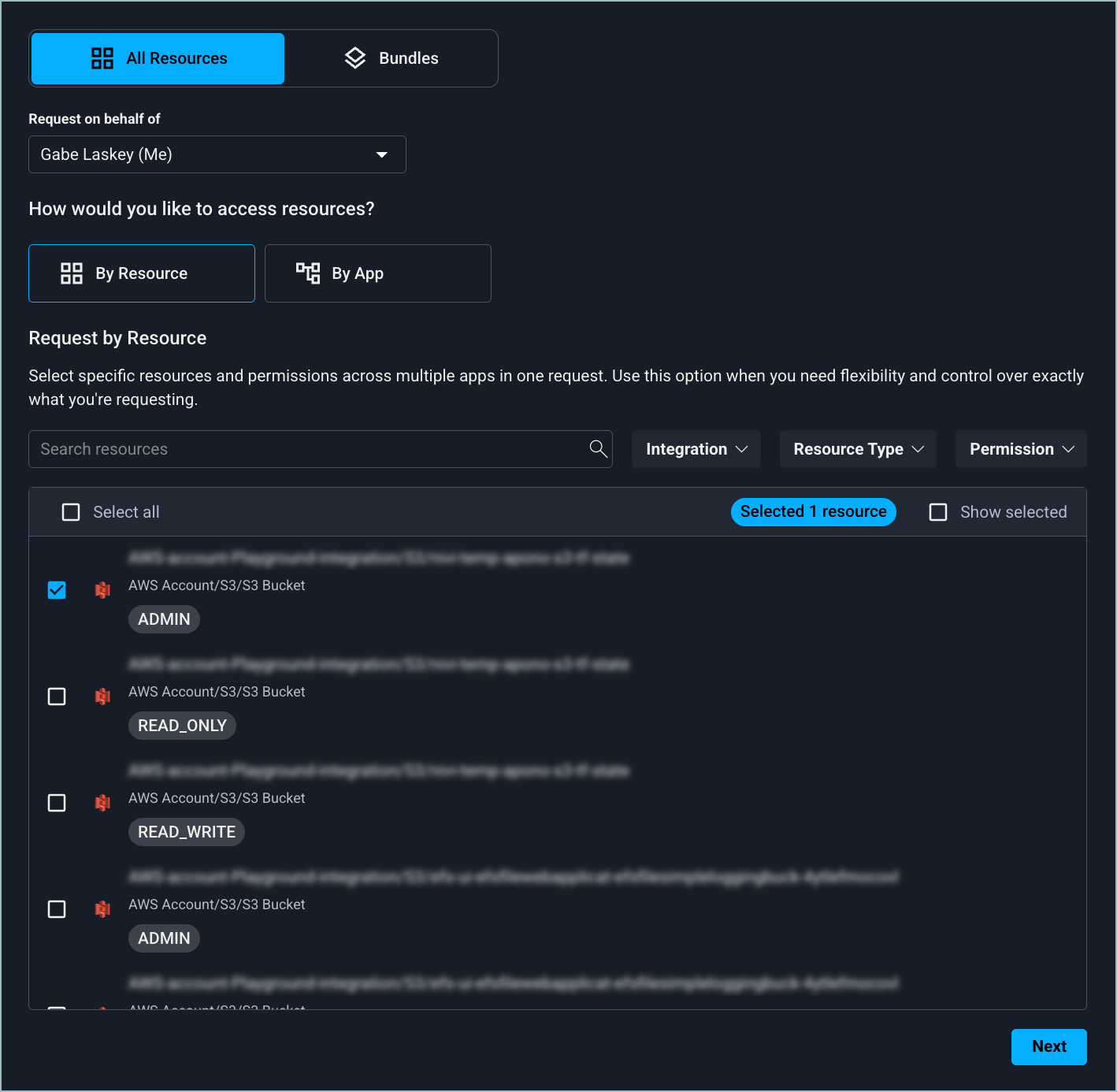 A resources request lets you select specific resources and permissions from all available items across cloud environments. Upon submission, Apono separates the form into individual requests based on each resource's access flow.