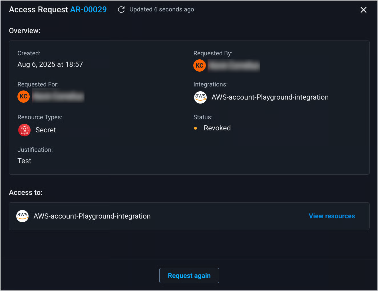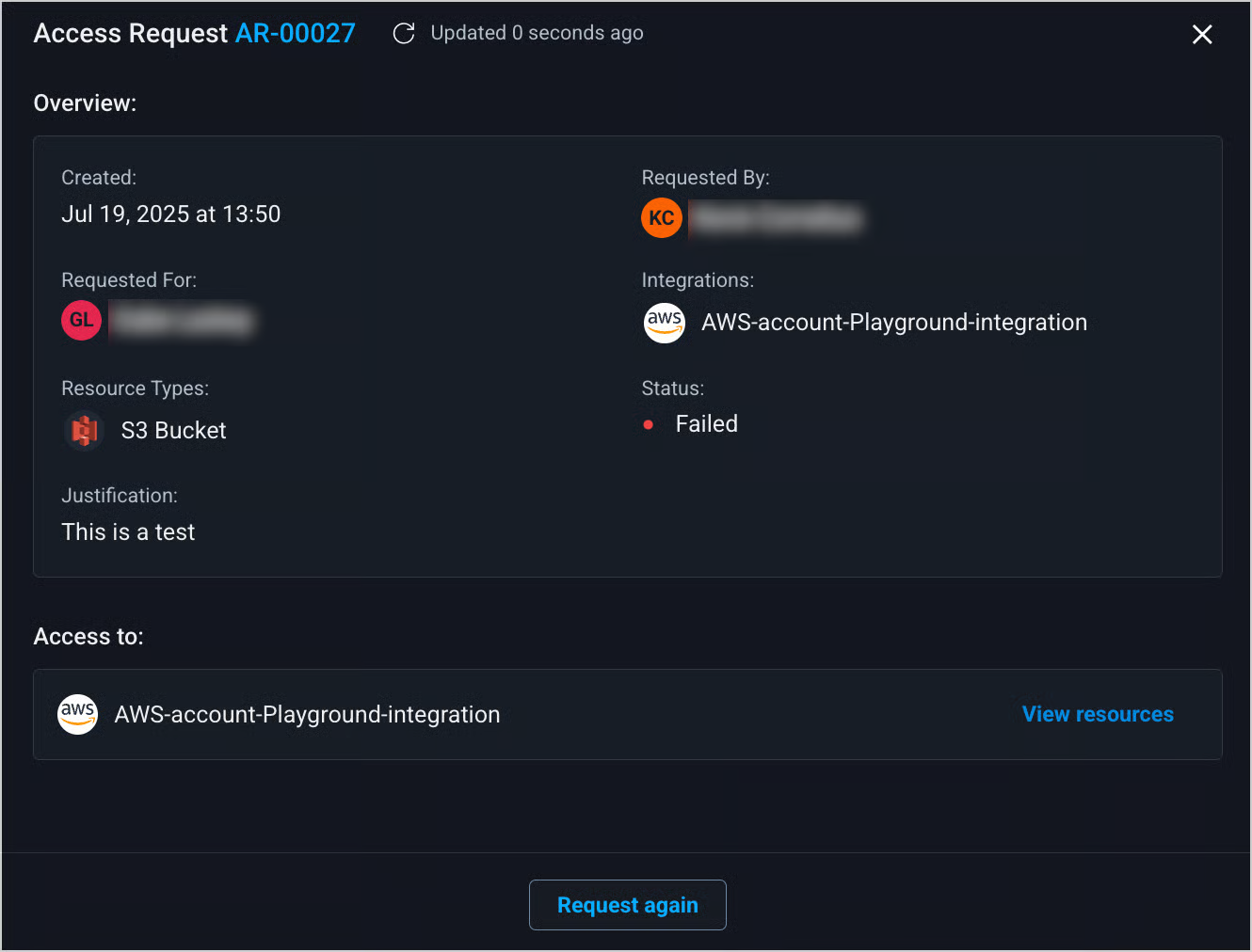 4. (Optional) Click [**Request again**](#request-access-again) to resubmit the request.