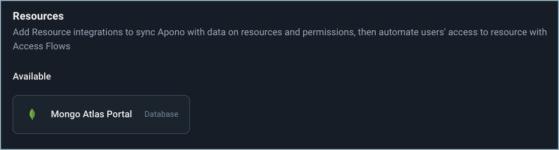 1. On the [**Catalog**](https://app.apono.io/catalog?search=mongo+atlas+portal) tab, click **Mongo Atlas Portal**. The **Connect Integration** page appears.
