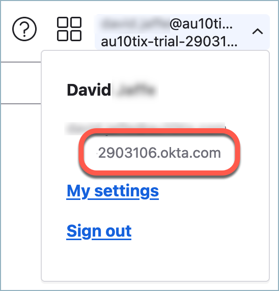 * Domain. Your OKTA organization domain name. Can be found in Okta admin portal, below your username in the upper right corner, as follow: