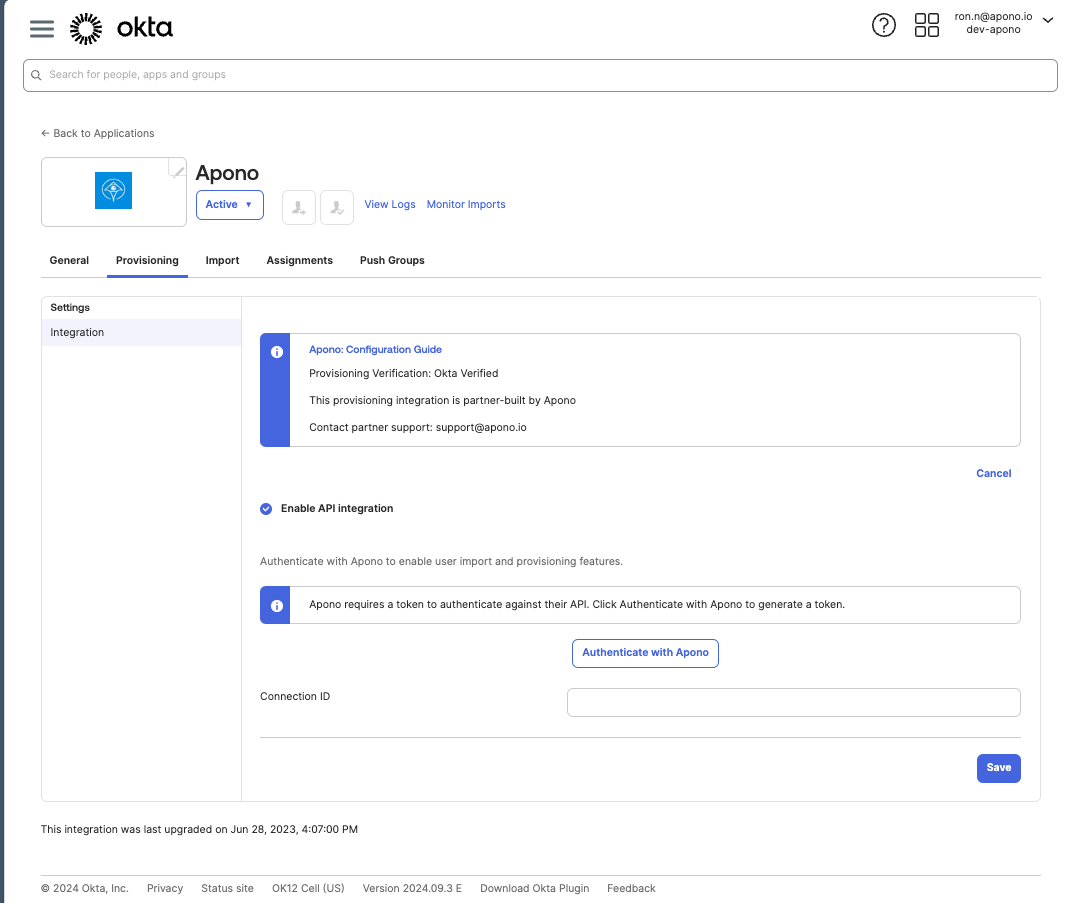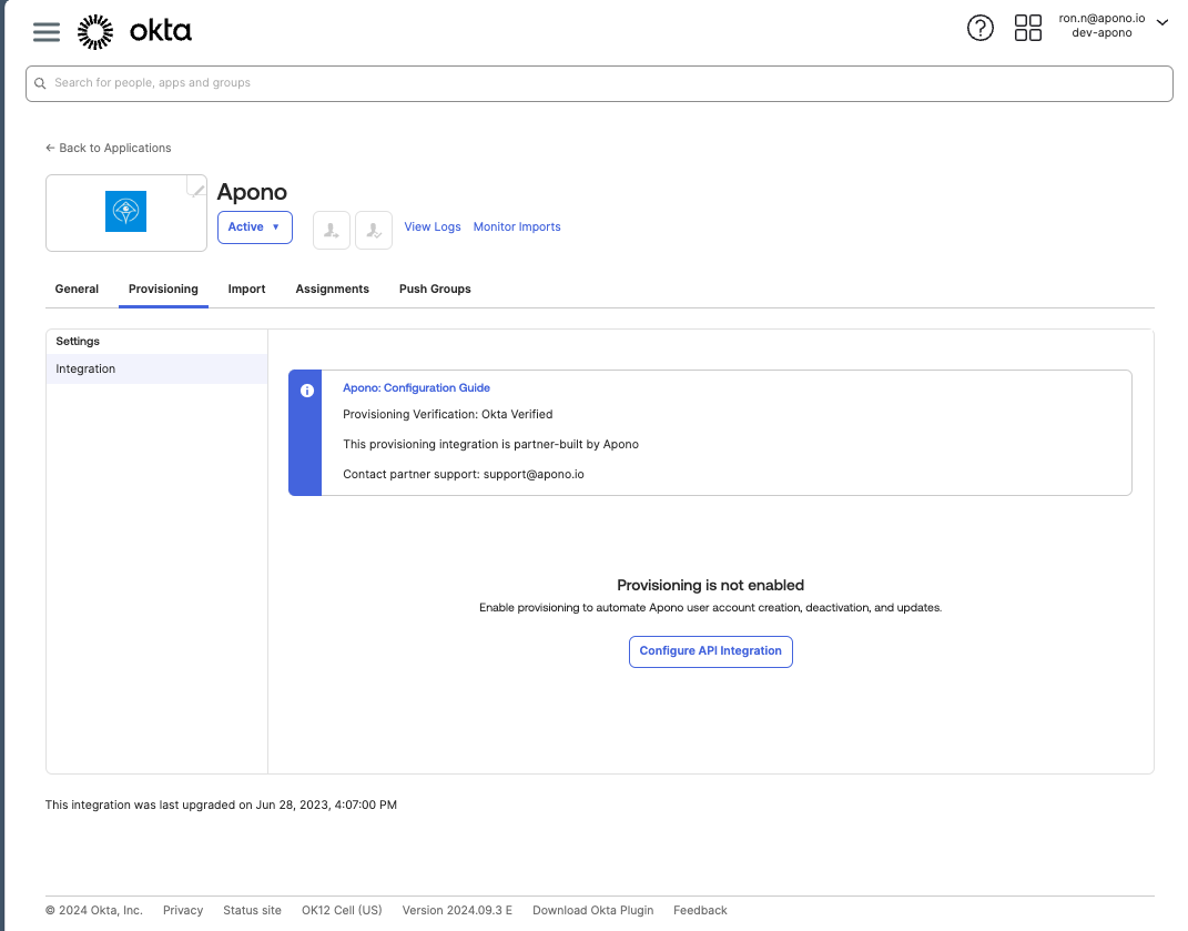 3. Click on the “Provisioning” tab in the application. Under the “Integration” panel, click the "Configure API Integration".