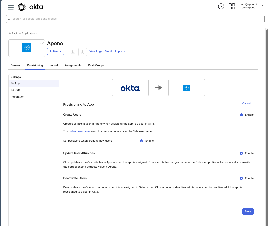 If your organization uses Okta SCIM to manage your employees’ access to apps, tools and services, you can take advantage of Okta’s “Provisioning” feature to automatically sync users and groups to Apono, allowing you to create just-in-time group membership based on Access Flows and user requests.