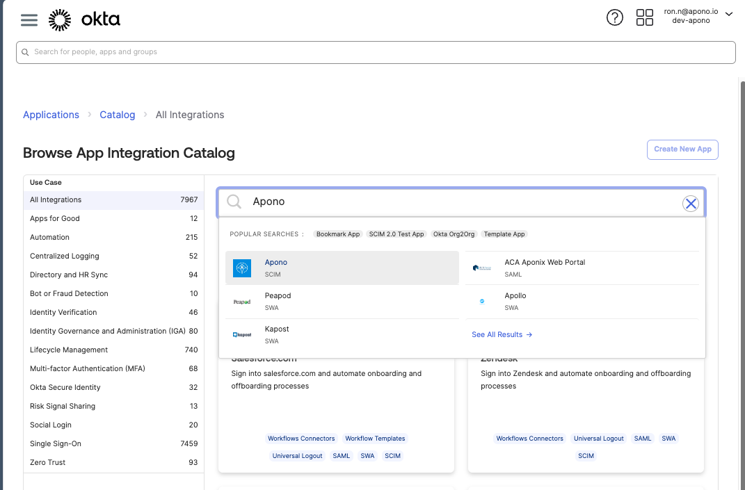 1. Under the **Applications** tab, select **Browse App Catalog** and search and add **Apono** SCIM app.