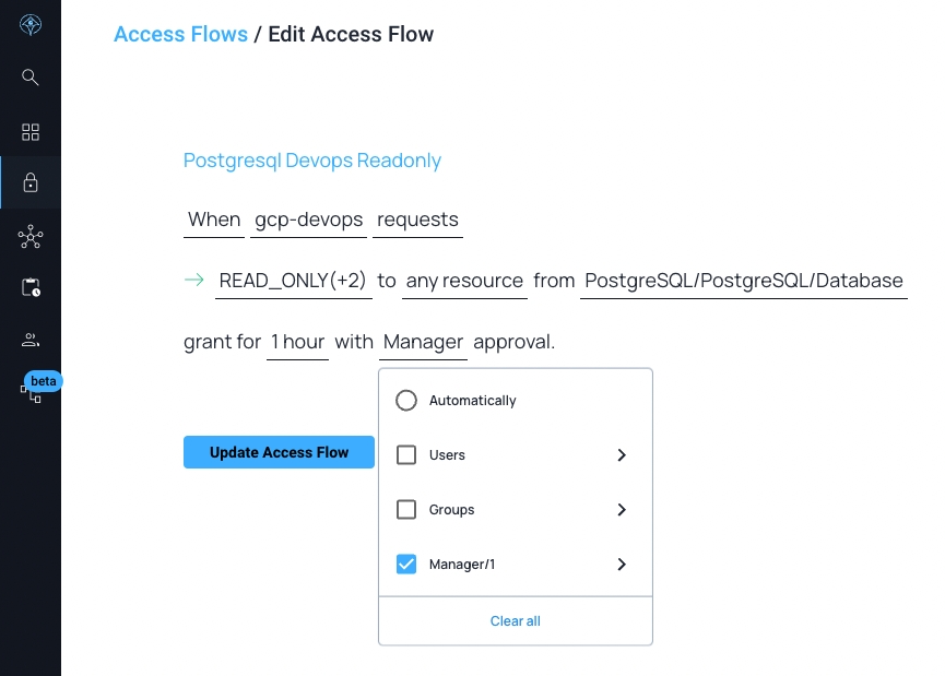 Then, all you have to do is set the Access Flow approver to Manager, and that's it! Apono continuously refreshes it's IdP data, so when managers change in the organization, so does Apono's Access Flows.