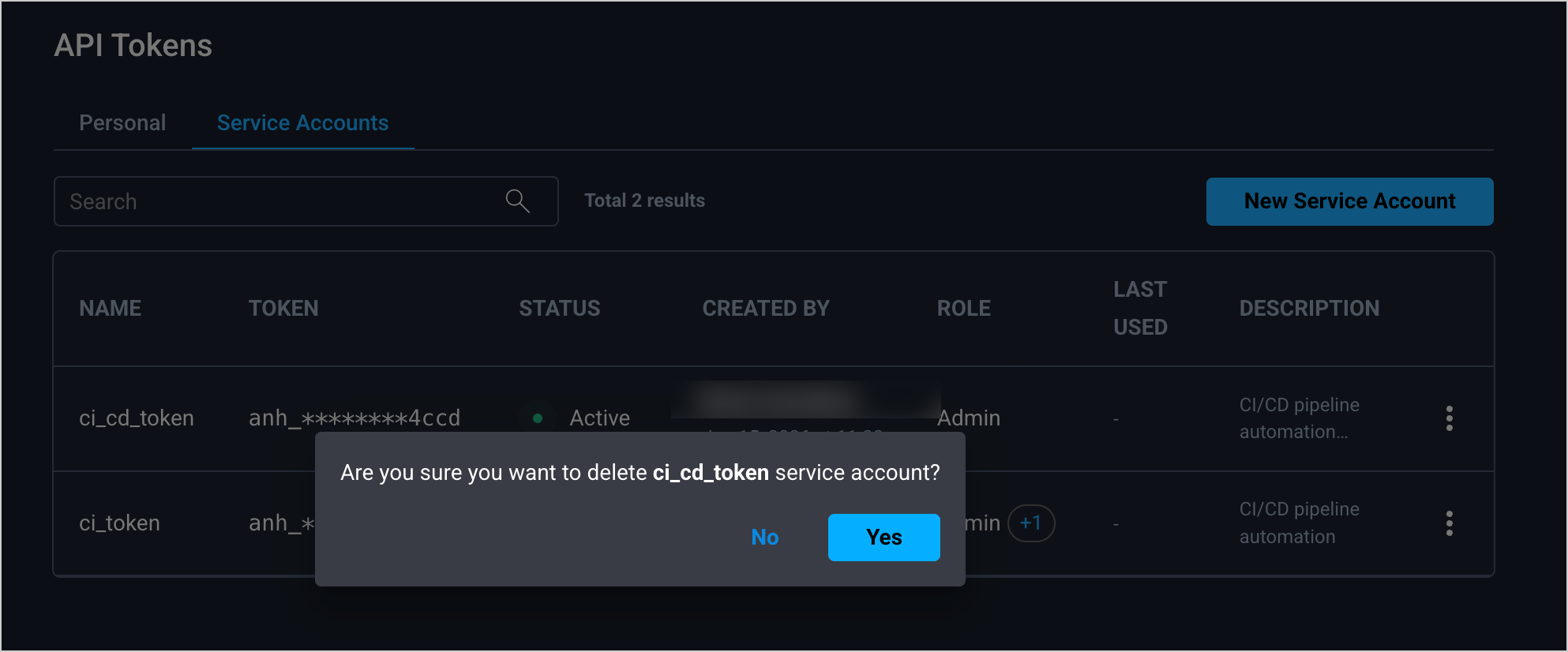 2. Click **Yes**. The API token is deleted and the **Service Accounts** tab appears.