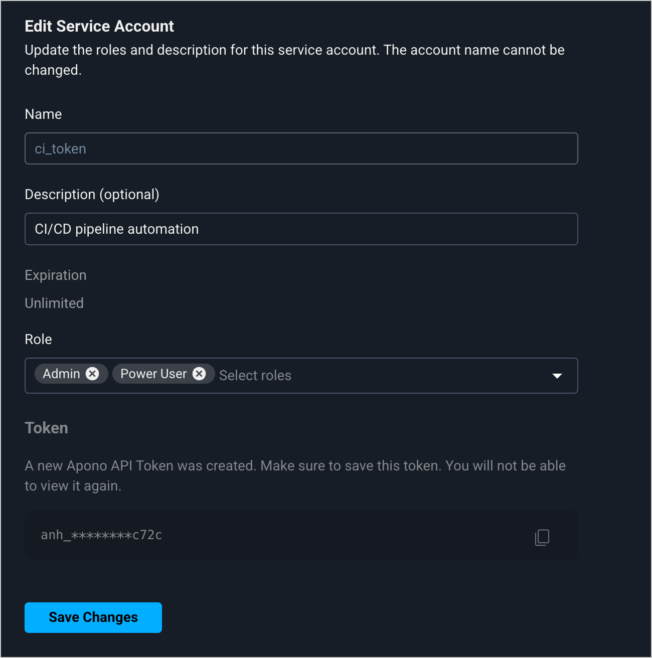 3. Click **Save Changes**. The API token is updated and the **Service Accounts** tab appears.