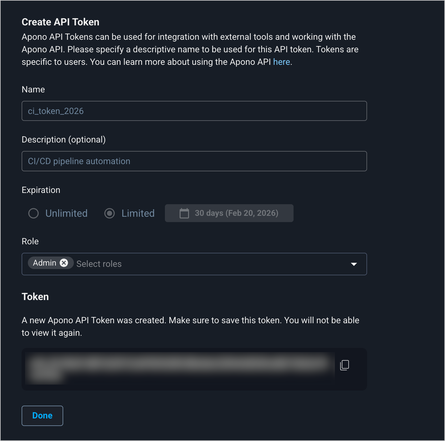 <table><thead><tr><th width="266.12890625">Expiration</th><th>Description</th></tr></thead><tbody><tr><td><strong>Unlimited</strong></td><td>Non-expiring token</td></tr><tr><td><strong>Limited</strong></td><td><p>Time-bound token</p><p>Follow these steps:</p><ol><li>Choose <strong>Limited</strong>. The default <strong>30 days</strong> option and expiration date will appear in a blue box.</li><li>(Optional) Click the expiration to select a different duration.</li></ol></td></tr></tbody></table>