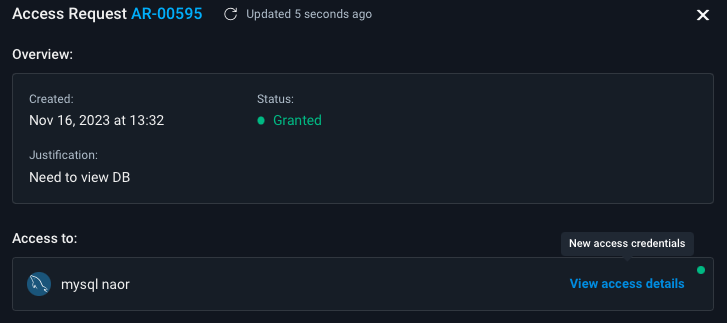 For granted requests that contain new credentials, Apono adds a green dot and "New access credentials" to the View access details button.