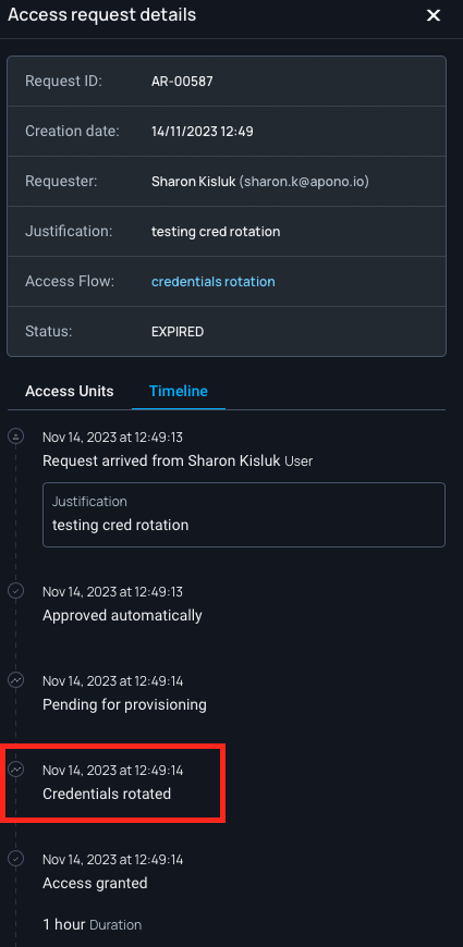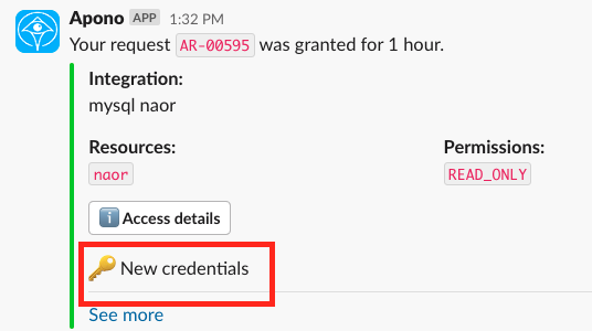 For granted requests that contain new credentials, Apono adds "🔑 New credentials" under the Access Details button.