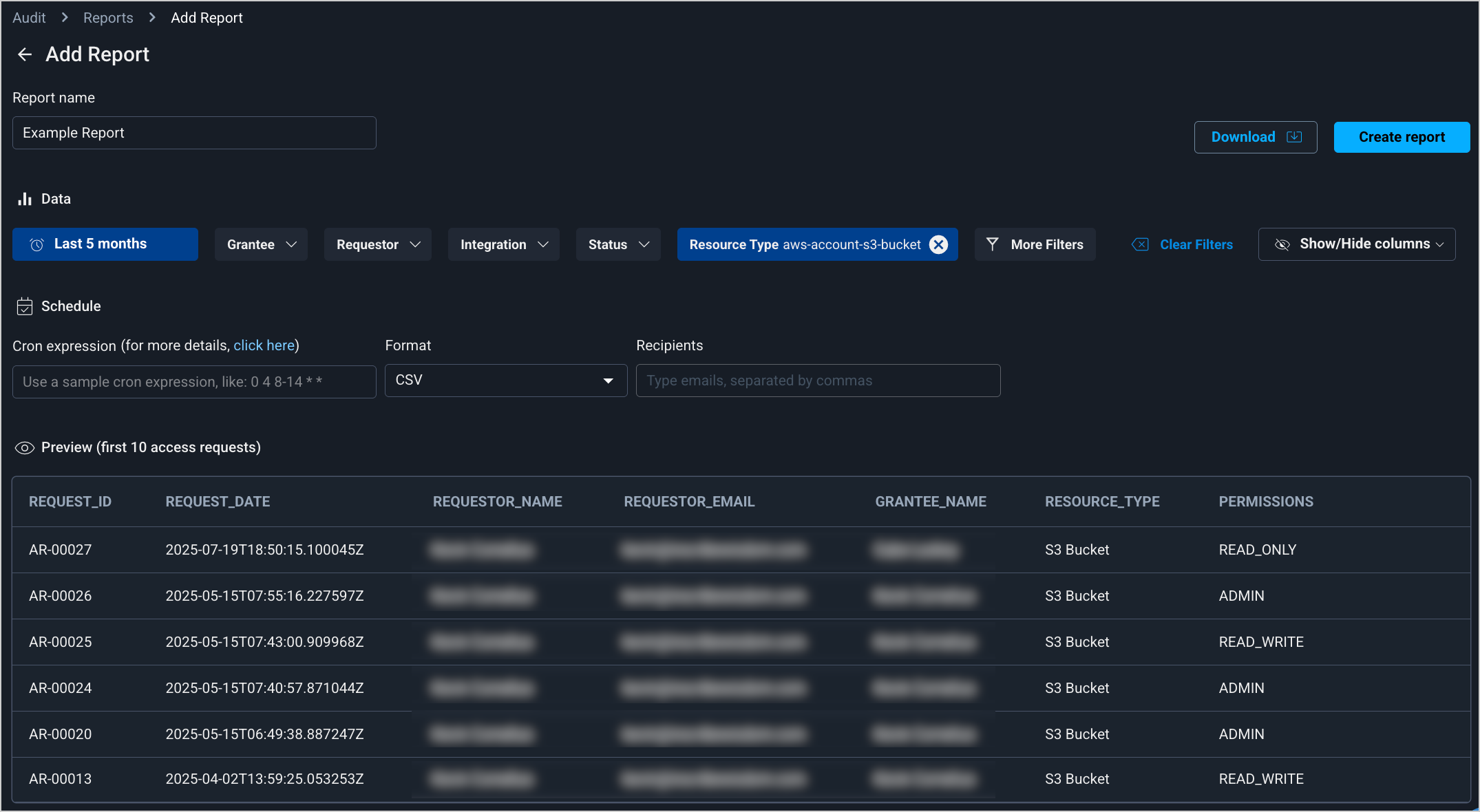 As you apply filters, a sample of the report information appears and updates in real time under Preview (first 10 access requests). One access request may have multiple rows of data.