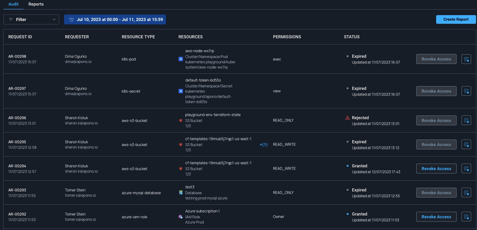 Use the Apono UI to see every access request: who asked access to what, with which permission, and when.