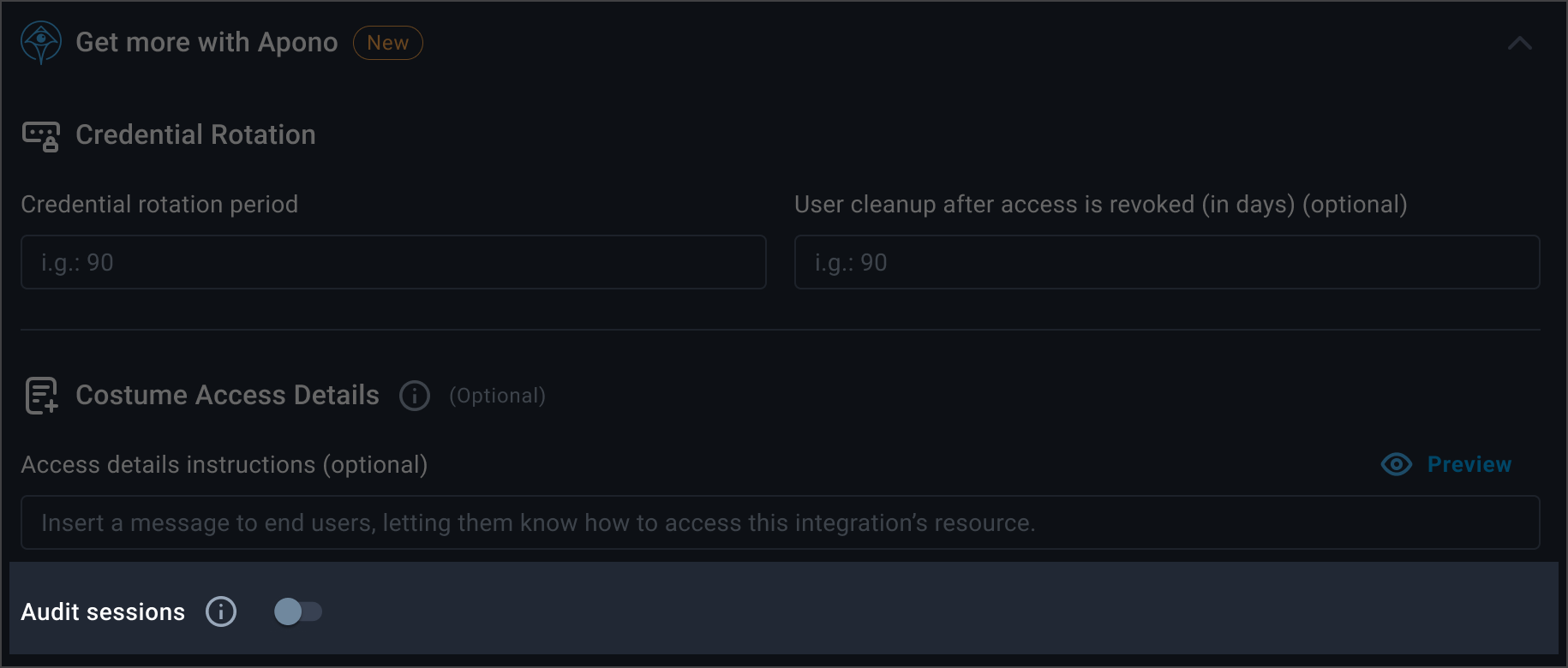 2. Under **Get more with Apono**, toggle **Audit sessions** to **ON**. The toggle will appear green when enabled.