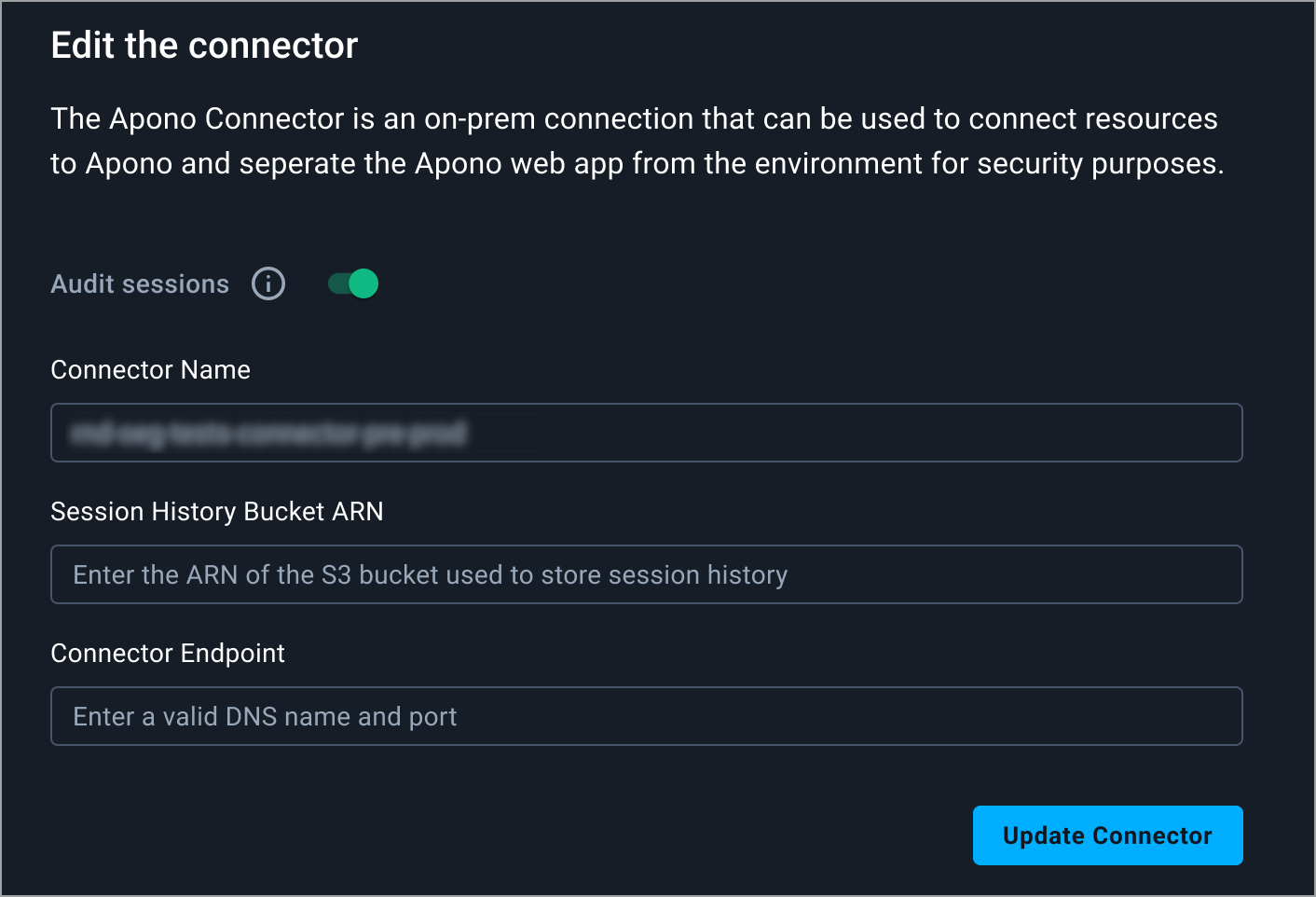<figure><img src="https://1094436629-files.gitbook.io/~/files/v0/b/gitbook-x-prod.appspot.com/o/spaces%2Fv6MBfUGvblSdAz31yJXm%2Fuploads%2Fgit-blob-fa382789e27b2311332b1af95329ffd8e9d37948%2Fsession-audit-connector-enablement%20(1).png?alt=media" alt="" width="563"><figcaption><p>Edit the connector page</p></figcaption></figure>