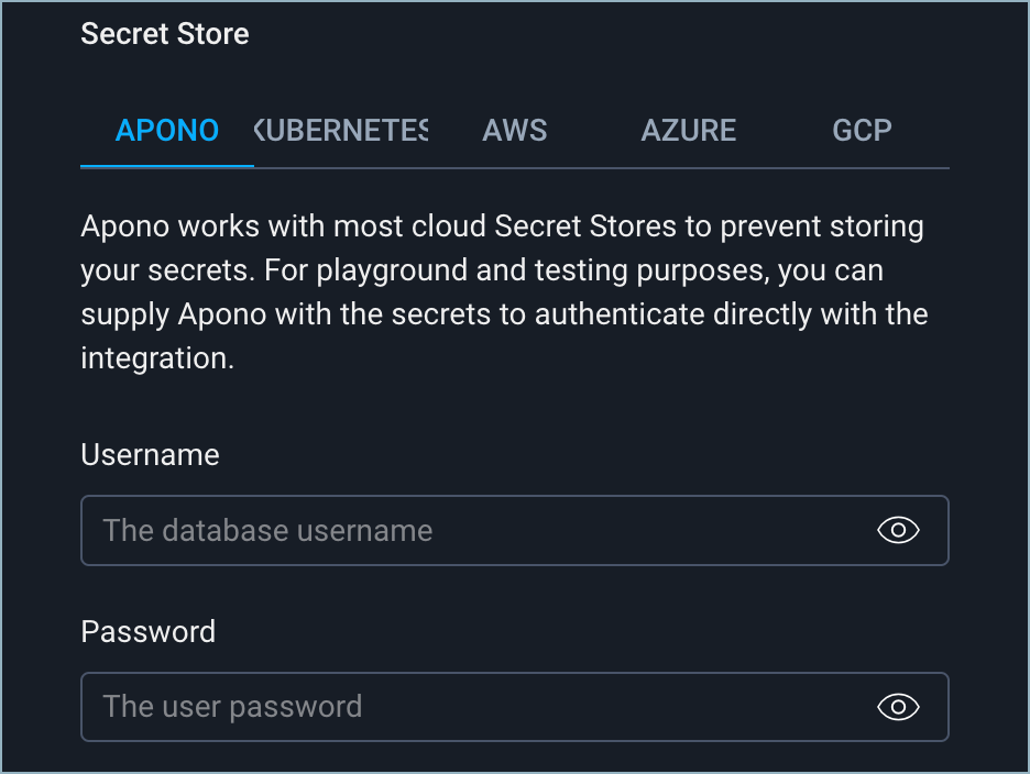 We advise creating a secret in an [AWS](https://docs.apono.io/docs/apono-connector-for-aws) , [Azure](https://docs.apono.io/docs/apono-azure-connector) , [GCP](https://docs.apono.io/docs/apono-connector-for-gcp) , or [Kubernetes](https://docs.apono.io/docs/apono-connector-for-kubernetes) environment. Managing secrets in a Secret Store allows Apono to sync and provision access to cloud resources without needing to store credentials for a specific environment in Apono.