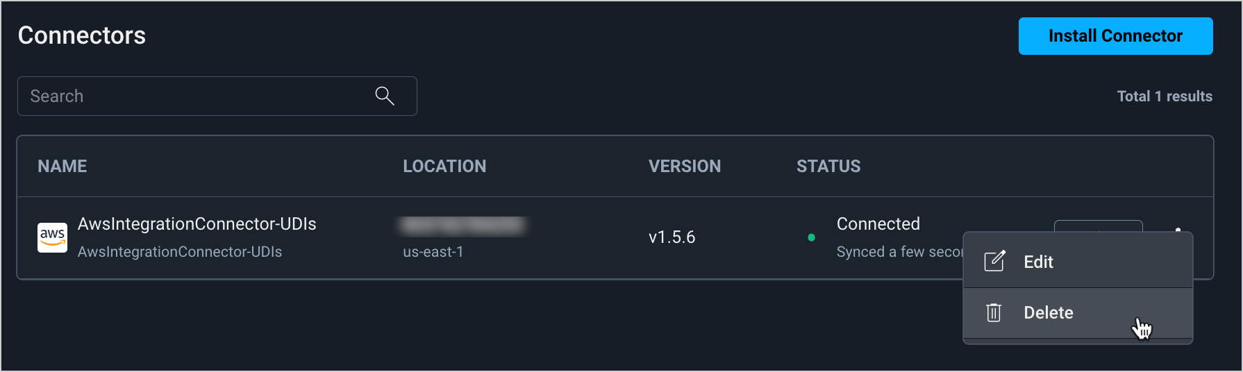 3. In the row of the connector, click ⠇**> Delete**. A confirmation popup window appears.