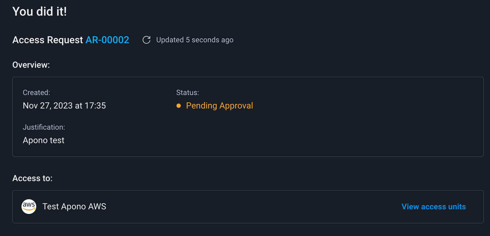 You can also Revoke the access you were just granted to see how Apono deprovisions access when the access time is up.