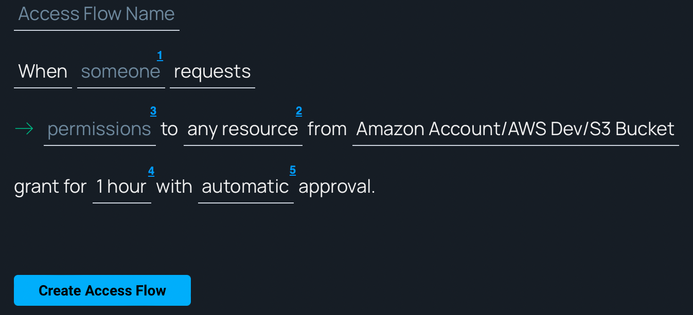 An Access Flow is a smart, dynamic access workflow or policy in human readable language that determines who can request access to what, and what the access duration and approval flow should be. Read more about Access Flows here.