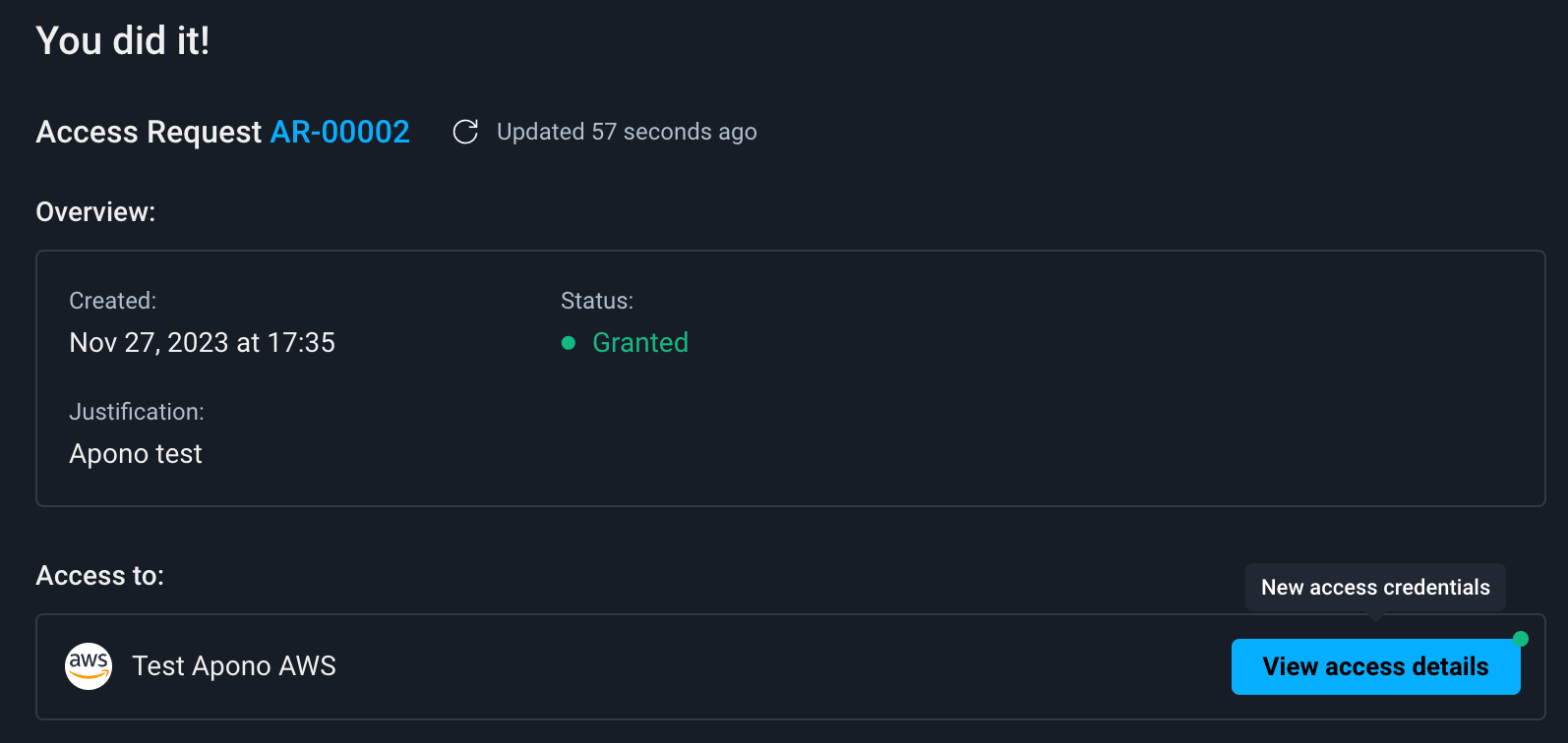 You should see a success message indicating that Apono has successfully integrated with AWS Test.
