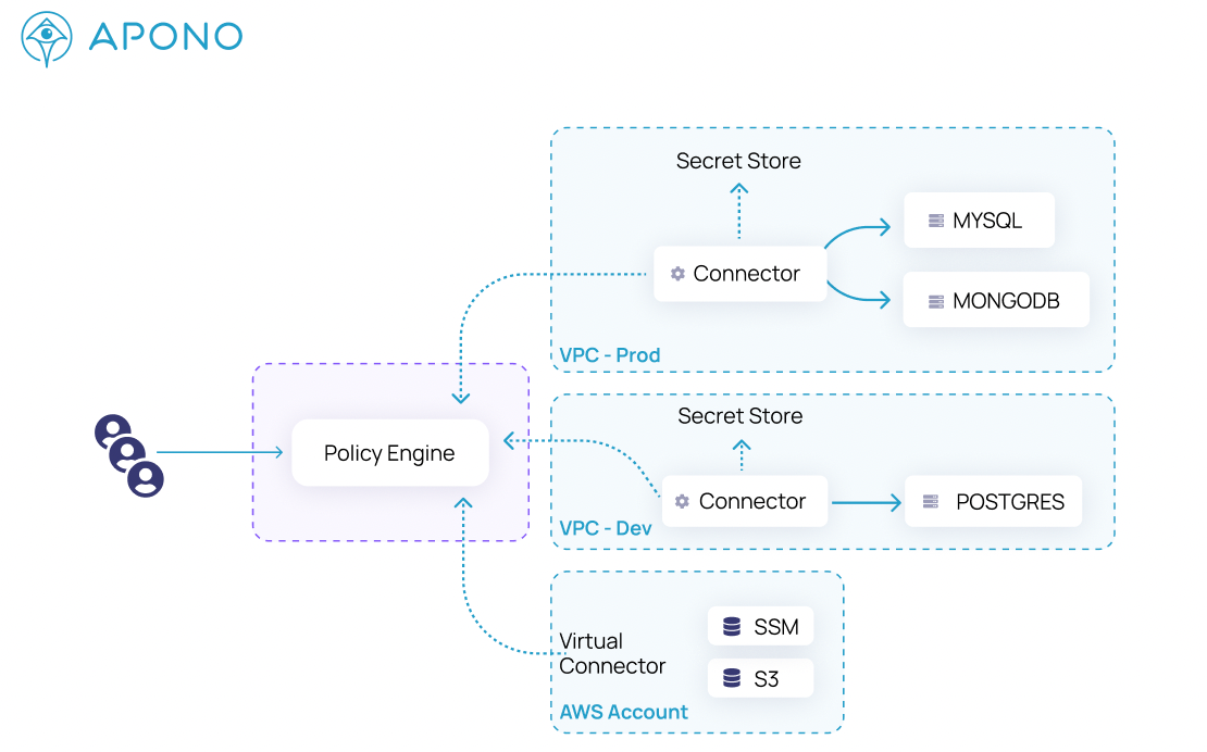 The Connector does not read, cache or store any secrets, nor does Apono need an account with admin privileges to function. The Connector contacts your secret store or key vault when it needs to sync data or provision access.