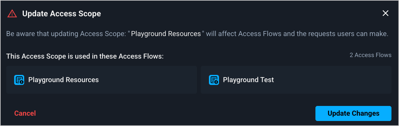 An access scope can only be deleted if it is not associated with an access flow. If an access scope is linked to one or more access flows, a popup window will appear with links to the relevant access flows: