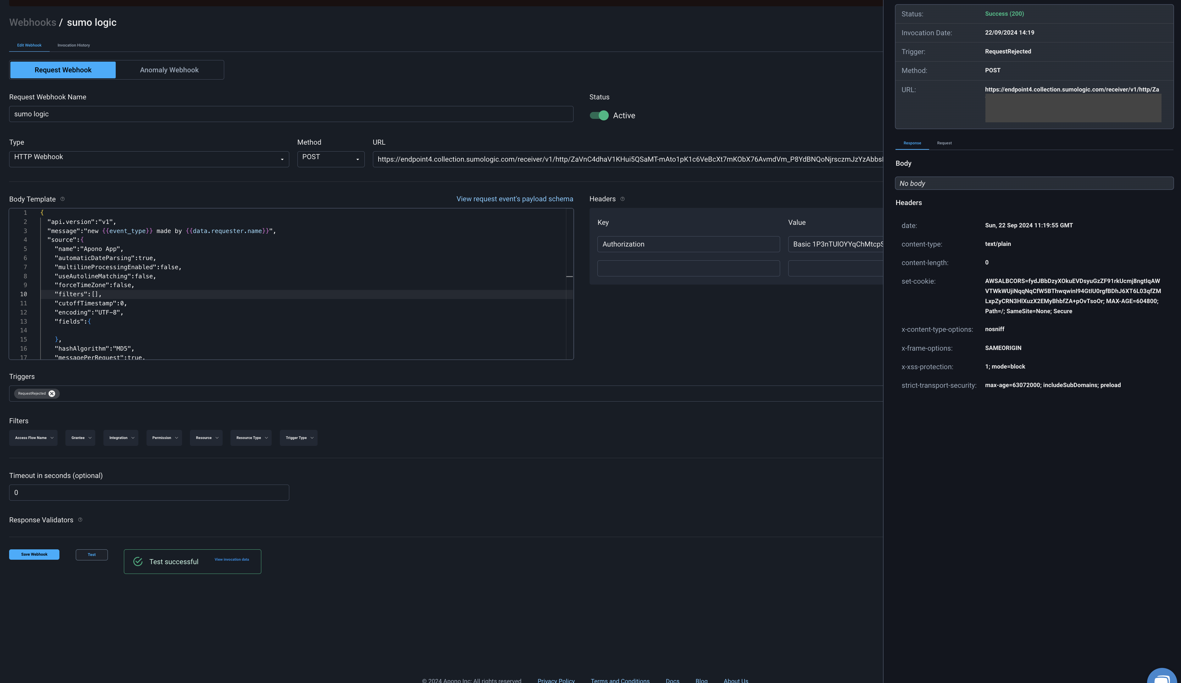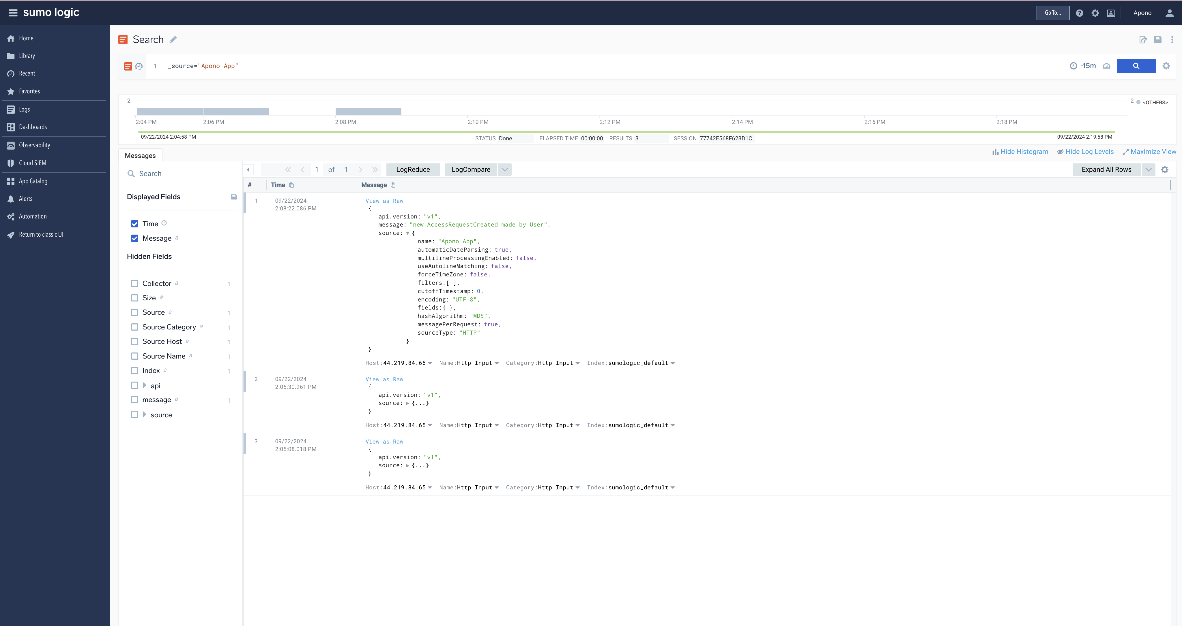 Apono access request logs will be sent to Sumo Logic based on the triggers you have selected.